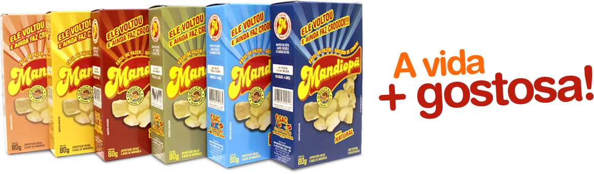 Mandiopã é um aperitivo de preparo instantâneo e está no mercado há mais de 60 anos. Você encontra Mandiopã nos sabores queijo, bacon, natural, camarão, batata e alho.